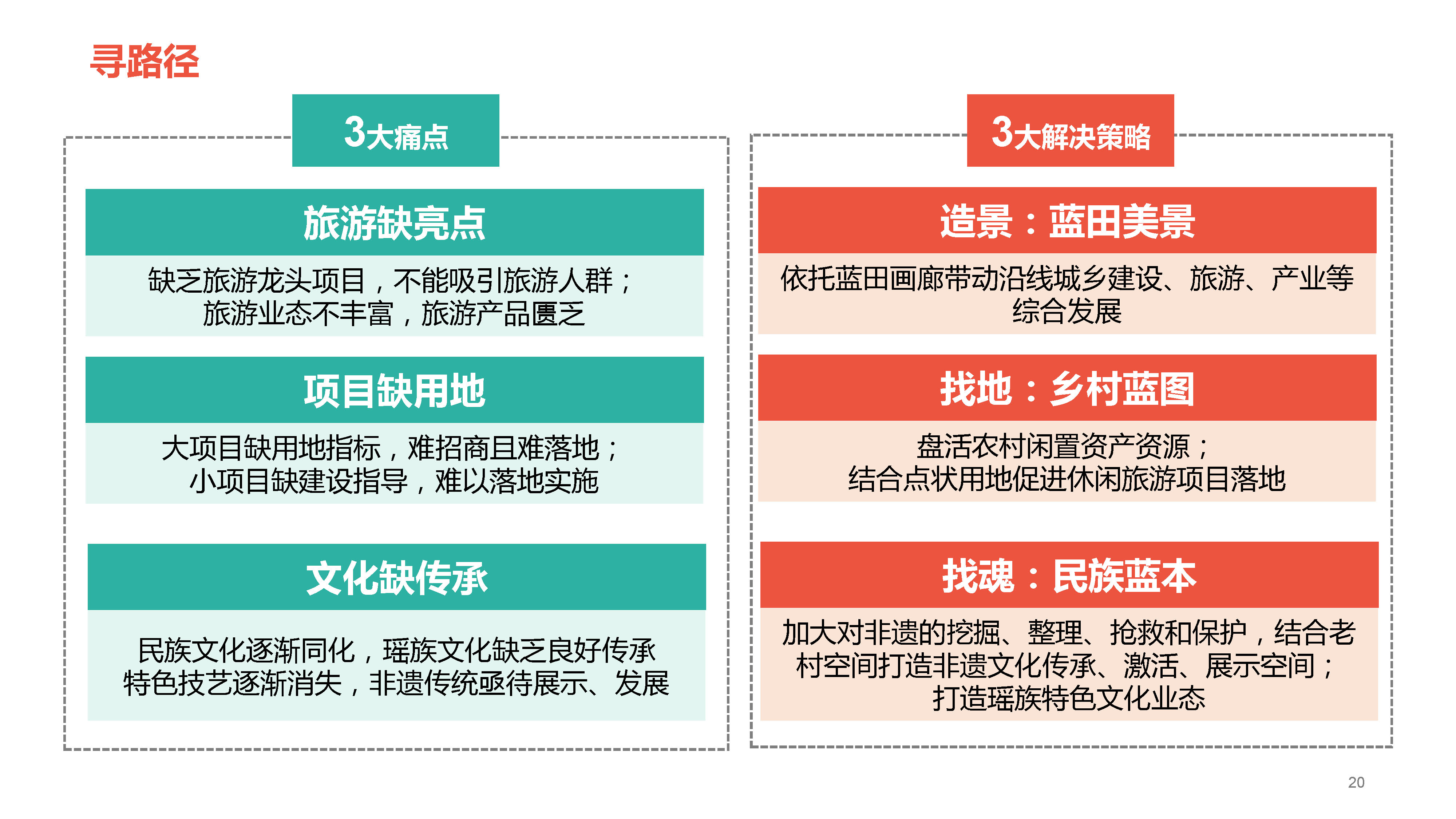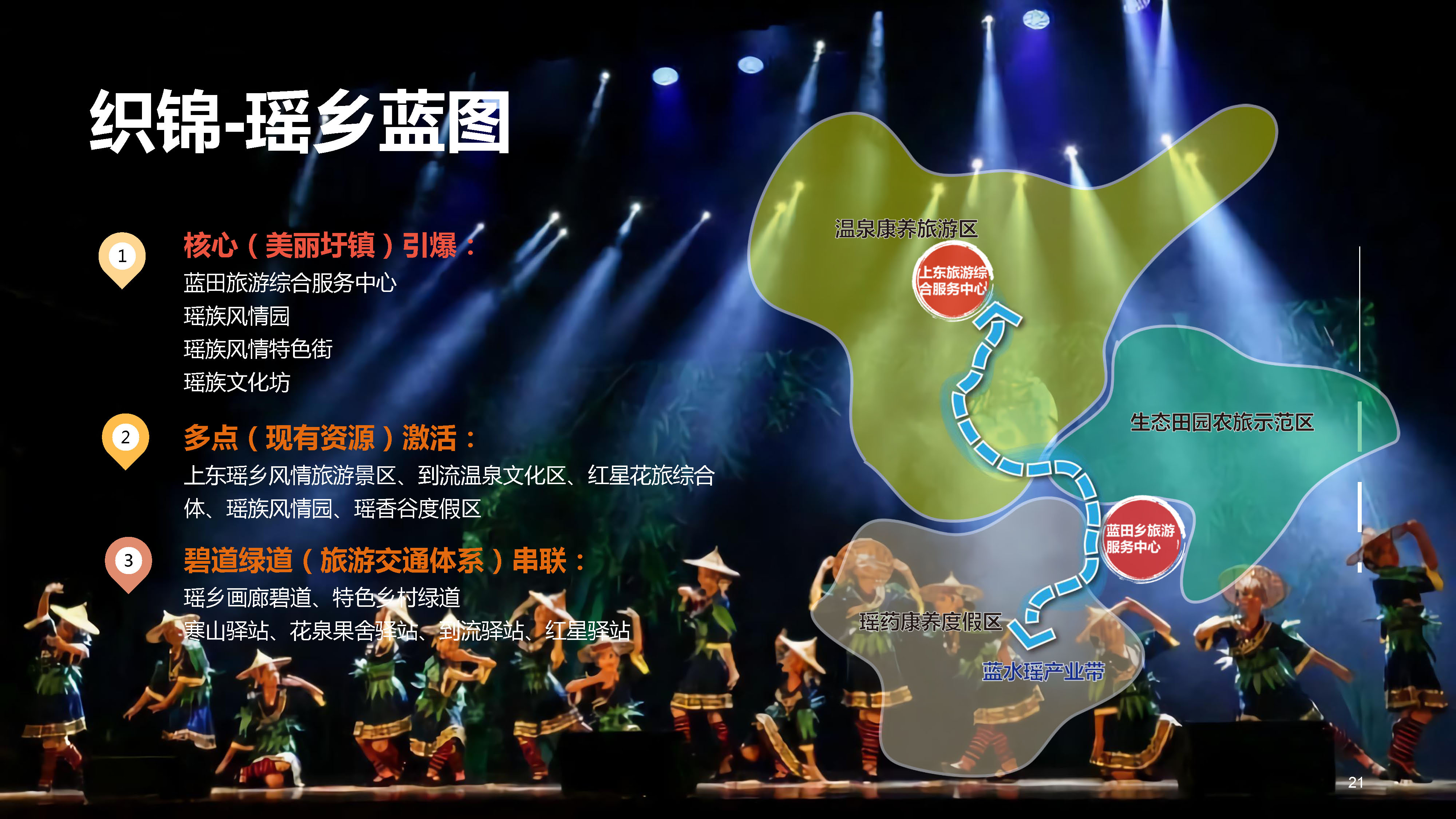 民族蓝草,千年瑶乡,以文化内涵凸显蓝田旅游识别性,以“全域景区化”定位蓝田旅游新高度,打造4.0版本的民族乡村旅游度范式,大湾区世外瑶乡康养旅游目的地。针对现状三大痛点,以造景、找地、找魂为本次规划的破局策略,形成“两心一带三区”的全域旅游格局,两心为上东村4A景区综合服务中心和瑶族风情园暨蓝田乡旅游服务中心;一带指沿蓝田河统筹沿岸七村打造贯通南北的滨河休闲产业带;三区为温泉康养旅游区、生态田园农旅示范区和瑶药康养度假区。