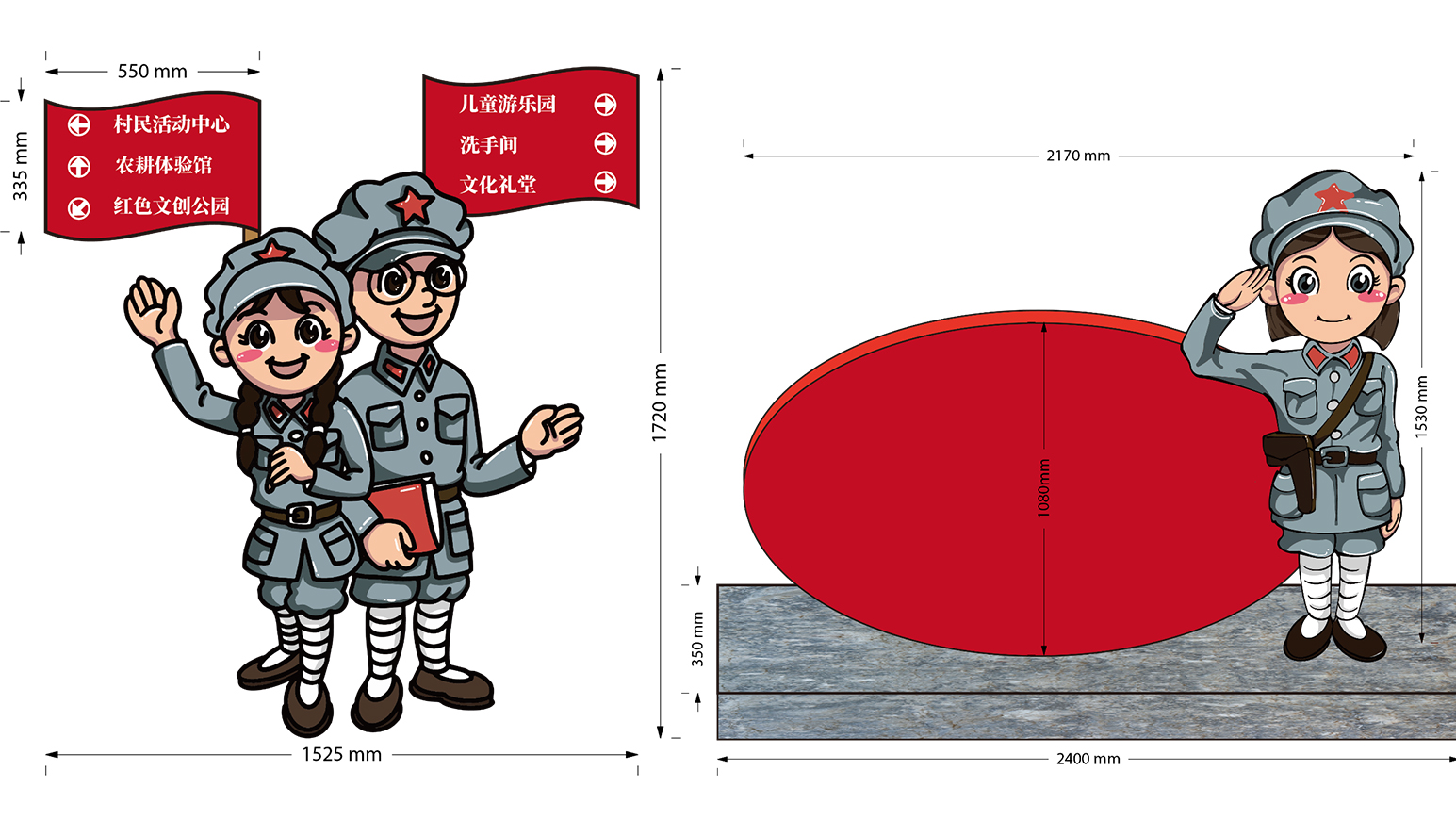 土桥村作为东莞最早一批建立党支部的村,在抗战时期土桥村也涌现了许多参与前线的英勇战士。以“土桥小士兵”造型导视牌作为土桥的形象标识之一,明确突出了土桥村具有厚重“红色文化”、“党建文化”的历史特点。此外,延续清溪鹿文化,结合土桥红色历史设计了一组立体装置雕塑。